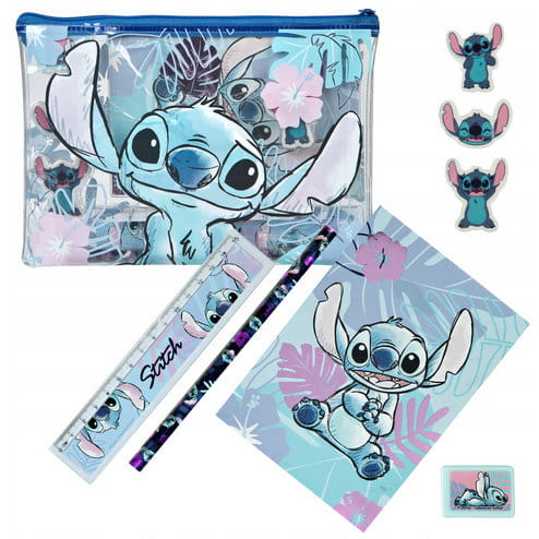 Stitch Zestaw szkolny [STLI6423] LILO i STITCH zestaw artykułów szkolnych, papierniczych. • Piórnik wykonany z miękkiego, elastycznego PCV, zapinany na suwak• Ołówek – twardość HB• Linijka – długość 15cm• Notesik w linię: wymiary: 15x10cm• Gumki kształtowe STITCH – 3szt• Temperówka z pojemniczkiem na ścinki• Wymiary piórnika: 17x21cm Kod EAN: 4043946315339Opakowanie zbiorcze: 12 szt.
