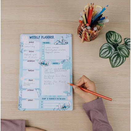 Stitch Planner tygodniowy [STLI0793] STITCH sympatyczny kosmita – Planner na biurko • Planner dla zajęć na tydzień w języku angielskim.• Format zbliżony do A4.• Kartki do wyrywania – 54 szt.• Wymiary: 28×19 cm Kod EAN: 4043946315322Opakowanie zbiorcze: 6 szt.