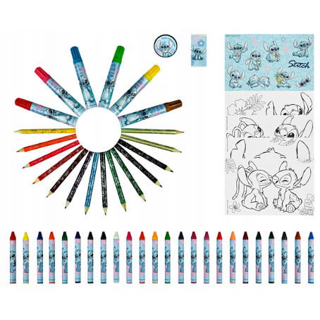 STITCH sympatyczny kosmita – Zestaw do kolorowania w walizeczce • Walizeczka z artykułami kreatywnymi.• 12 kredek ołówkowych mini z nadrukami bohaterów.• 6 flamastrów.• 24 kredki świecowe.• Gumka do ścierania.• Temperówka.• 2 ołówki mini z nadrukami bohaterów.• 4 małe kolorowanki.• 1 blister z naklejkami Kod EAN: 4043946318941Opakowanie zbiorcze: 6 szt.