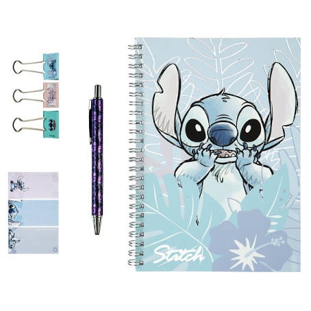 Stitch Kołonotes zestaw [STLI6434] STITCH sympatyczny kosmita – Kołonotes z akcesoriami. • Kołonotes A5 w pastelowych barwach.• Zestaw zapakowany w pudełko prezentowe.• Długopis.• Karteczki memorki w trzech kolorach.• 3 klamerki do spinania dokumentów. Kod EAN: 4043946315292Opakowanie zbiorcze: 6 szt.
