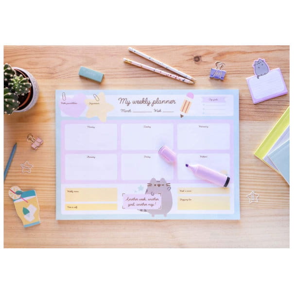 Pusheen Planner tygodniowy na biurko A3 [Foodie] [BPSA30002]• Planner tygodniowy dużego formatu z wyrywanymi kartkami.• Przeznaczony do położenia na blacie biurka.• Zawiera 54 kartki – jedną na każdy tydzień roku.• Format plannera: A3• Gramarura papieru: 80 g/m2• Wymiary plannera : 29,7 cm x 42 cm Kod EAN: 8435497252632Opakowanie zbiorcze: 1 szt.