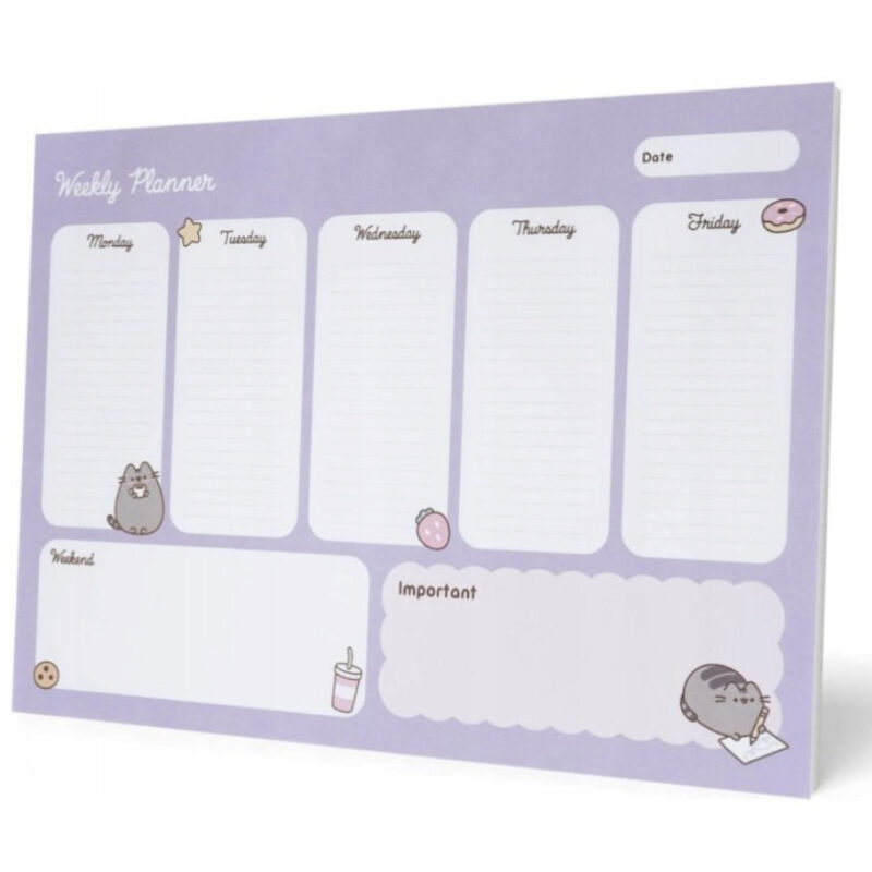 Pusheen Planner Tygodniowy [BPSA40092] Pusheen planner, plan zajęć, lekcji formatu A4. Kartki do wyrywania – 54 arkusze Od spodu tektura z nadrukiem kotków Wymiary: 29,5 x 21 cm Kod EAN: 8435497298586 Opakowanie zbiorcze: 6 szt.